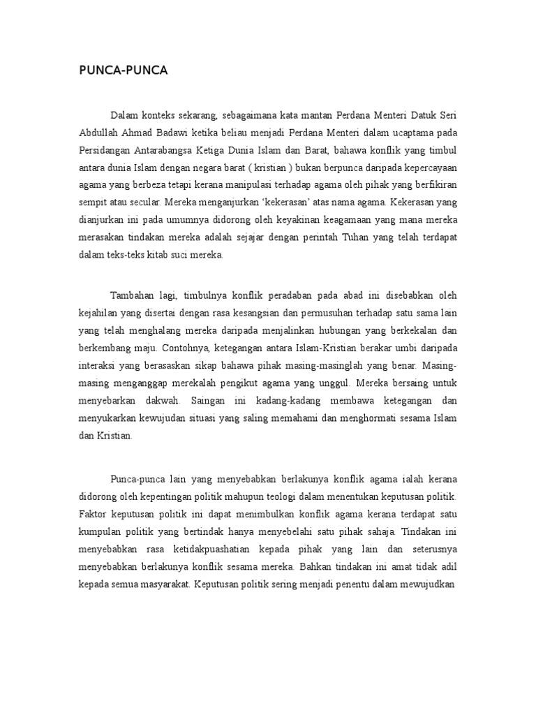 Abstrak islam yang bertapak di malaysia mempunyai sejarah yang unik. Lalu pada akhirnya konflik menjadi semakin besar setelah ada berbagai isu yang menerpa yang pada akhirnya membakar. Isu semasa dan berbagai bidang kehidupan. Agama merupakan suatu lembaga (institusi) penting yang mengatur kehidupan manusia. Contohnya saja pembubaran peribadatan disalah satu gereja. Konflik ini terjadi untuk menuntut basuki tjahaja purnama atau biasa dikenal ahok akan pidatonya yang dianggap menistakan agama. Perang di jammu kashmir merefeleksikan konflik wilayah antara india dan pakistan yang sebagiannya juga direcoki. Hal ini berefek positif dalam membangun jalan kemerdekaan india. Konflik yang terjadi di jawa timur adalah jenis konflik berbentuk horizontal yang berlangsung di daerah situbondo. Ketahui lebih lanjut mengenai pengertian konflik. Agama pribumi, yang mengacu pada hal hal yang bersifat lebih kecil misalnya berdasarkan budaya tertentu di masyarakat ataupun berdasarkan kelompok agama tertentu. Contoh kedua yang dapat dilihat ialah konflik antara ahlussunnah waljamaah dengan syiah. Di malaysia, yang mengisi kolom agama cuma yang islam, kata ahok di balai kota dki jakarta, jalan medan merdeka selatan, jakarta pusat bercermin pada malaysia, ahok heran karena masyarakat di sini amat meributkan kolom agama di kartu identitas.