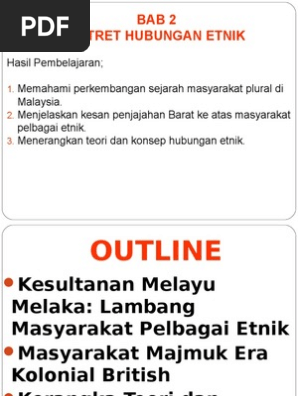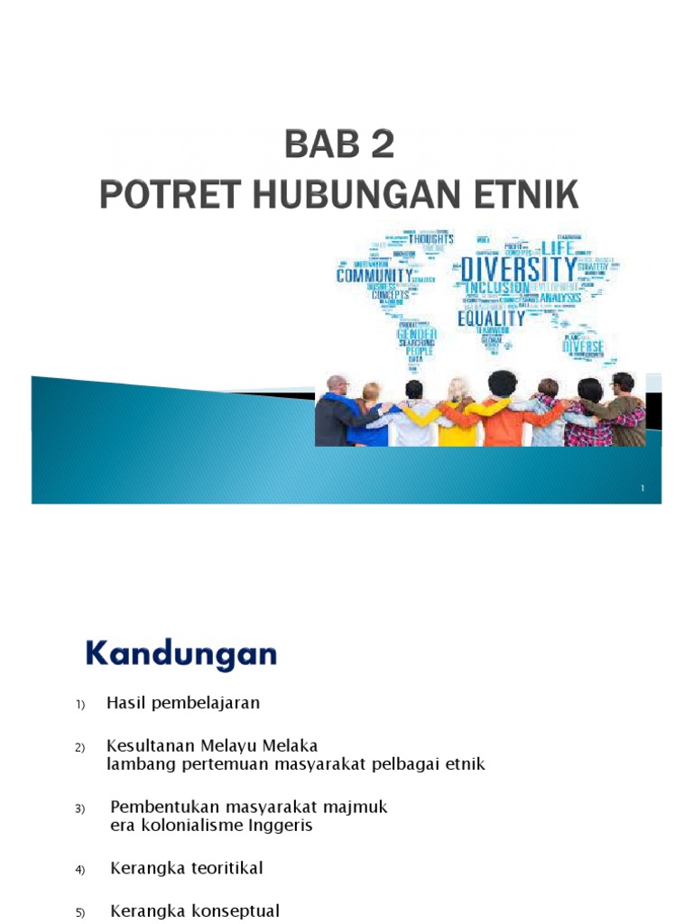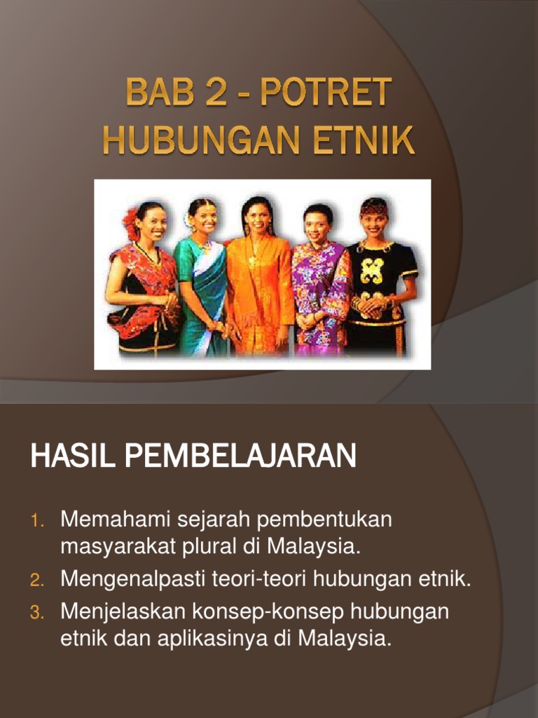 Melaka merupakan pusat perdagangan antarabangsa sehingga dikenali sebagai venice. Memupuk kesedaran kebangsaan dan kenegaraan bercirikan kerohanian, kemanusiaan, spiritual, dan mental. Potret hubungan etnik kesimpulan peranan utama membentuk budaya 1. 1 bab 2 potret hubungan etnik. 4 bentuk hubungan antara etnik:
