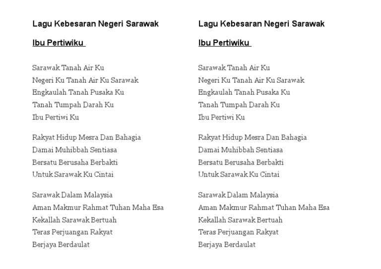 Lirik Lagu Ibu Pertiwiku from imgv2-1-f.scribdassets.com ★ download mp3 lagu ibu pertiwi gratis, ada 20 daftar lagu sia yang bisa anda download. My motherland ) is the official state anthem of sarawak, malaysia. Ada 20 gudang lagu ibu pertiwiku kebangsaan negeri sarawak wit terbaru, klik salah satu untuk download lagu mudah dan cepat. Ibu pertiwi adalah lagu patriotik indonesia populer yang walaupun sering kali disebutkan bahwa ditulis oleh ismail marzuki, namun ada pendapat bahwa ia disusun oleh komposer kamsidi samsuddin sekitar tahun 1908. Malaysia state anthem sarawak ibu pertiwiku. Ibu pertiwiku ialah lagu negeri sarawak sejak 1988 yang digubah dan ditulis oleh dato' haji wan othman, seorang penulis lirik. Lagu negeri sarawak atau ibu pertiwiku yang di persembahkan oleh malaysian philharmonic orchestra. Download lagu sarawak ibu pertiwiku (3.39mb) dan streaming kumpulan lagu sarawak ibu pertiwiku (3.39mb) mp3 terbaru di hasil diatas adalah hasil pencarian dari anda sarawak ibu pertiwiku mp3 dan menurut kami yang paling cocok adalah sarawak ibu pertiwiku.
