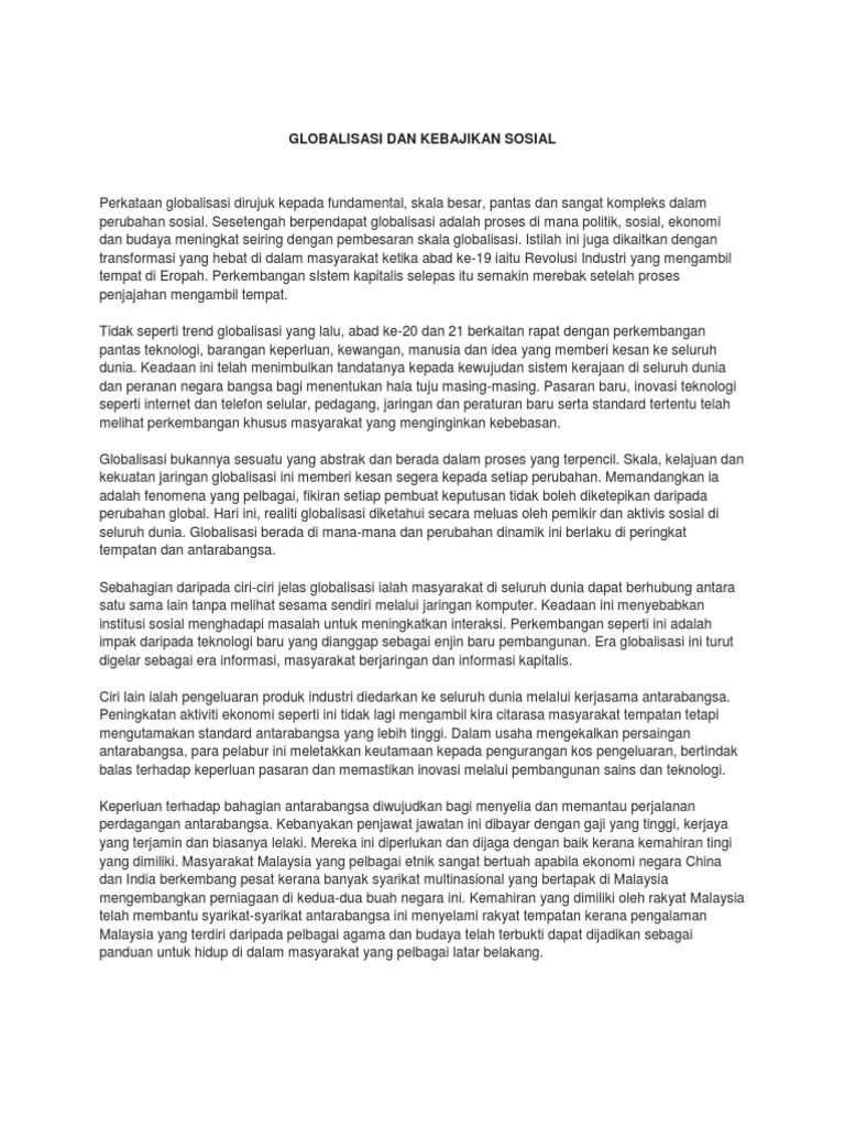 Doc Asgment Group Impak Globalisasi Fie Fiey Academia Edu from 0.academia-photos.com Tentu saja, globalisasi akan memberikan dampak kepada individu atau negara sekalipun. Maju yang lain, kita perlulah melangkah untuk mengenal pasti kesan globalisasi terhadap tfp. Globalisasi merujuk kepada satu cara hidup dunia tanpa sempadan dan saling berkaitan antara satu sama lain. Pasalnya, globalisasi diketahui mampu menjangkau berbagai aspek kehidupan manusia. Globalisasi tak selamanya berdampak buruk dalam hidup kita. Ada nilai positif yang harus kita ambil dalam hal ini, yakni banyak orang yang giat bekerja dengan bebagai keinginan yang dicapainya serta masyarakat mampu menghargai waktu dengan. Mungkin bisa dalam bidang pendidikan, ekonomi, politik ataupun sosial budaya. Walaupun secara umumnya globalisasi itu lebih memberi kesan kepada ekonomi dunia, namun bidang lain seperti pendidikan tidak terkecuali.