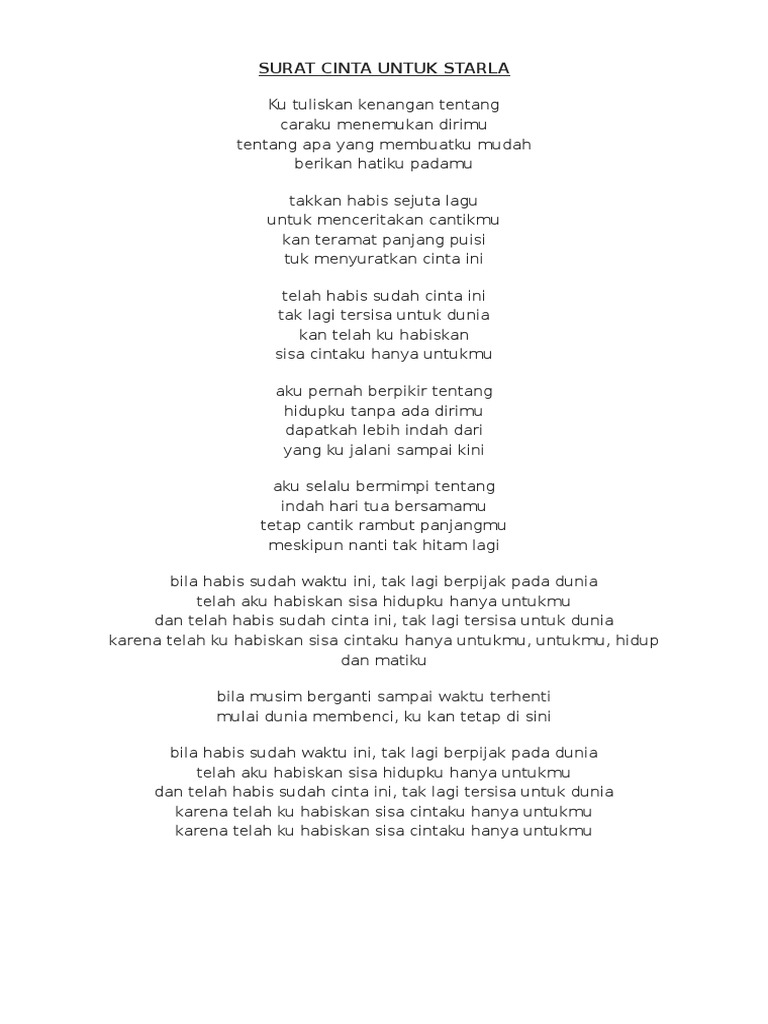 Lirik Lagu Surat Cinta Untuk Starla Doc from imgv2-2-f.scribdassets.com We did not find results for: Telah habis sudah cinta ini. Maybe you would like to learn more about one of these? Check spelling or type a new query.